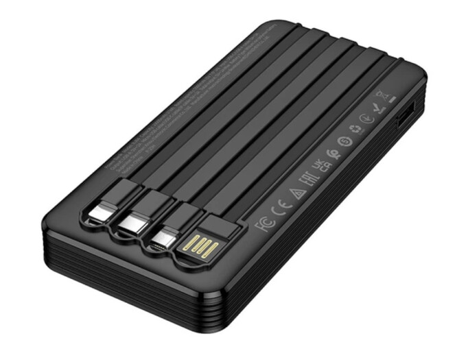 Головною особливістю є наявність чотирьох вбудованих кабелів, що робить його універсальним рішенням для користувачів з безліччю різних гаджетів. Кабелі компактно розміщуються на корпусі павербанка в спеціальних заглибленнях, вони не будуть плутатися і заважати при транспортуванні, а значить і прослужать набагато довше.